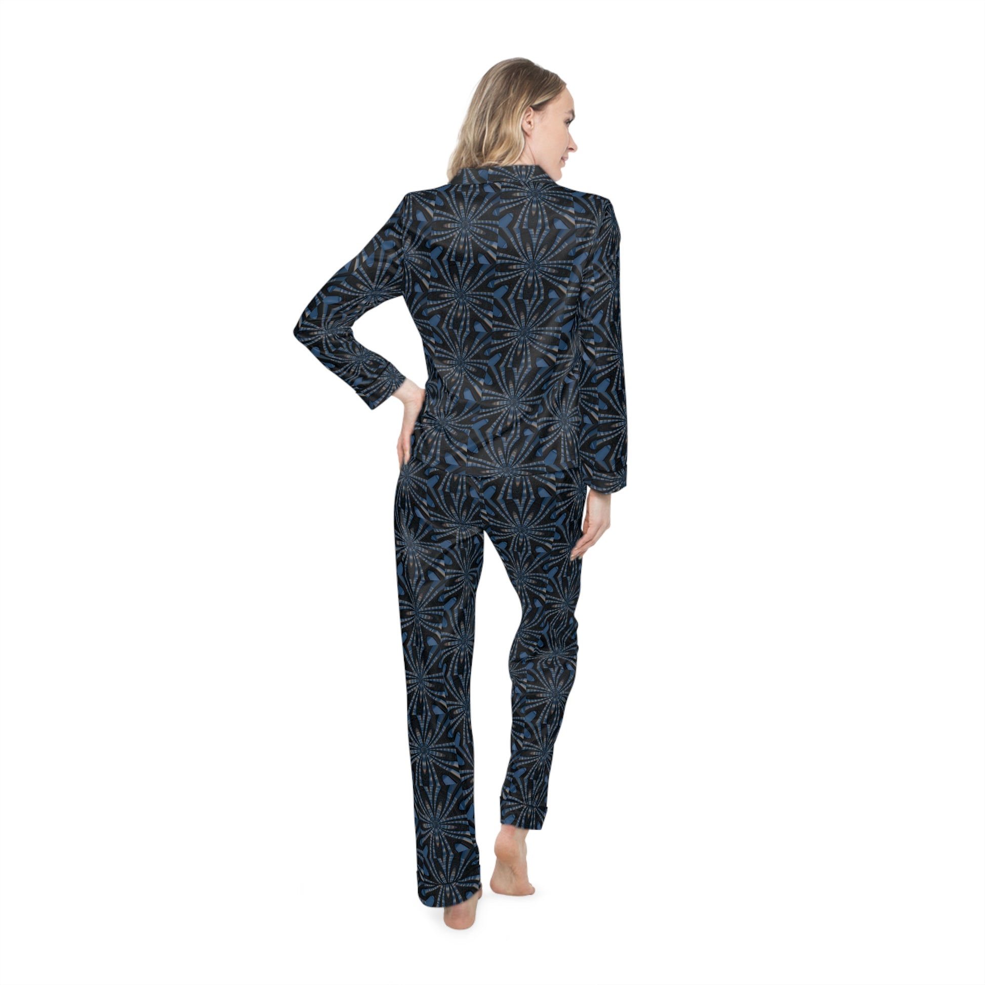Enjoy the Southwest vibes with these Women's Satin Pajamas, featuring a drawstring waist for the perfect fit and a notch lapel collar for a classic look. Made of 95% satin polyester and 5% spandex, this pajama set is super soft to touch and lightweight, ideal for leisure or nightwear. The seam thread color is closely matched to the design, with trim, drawstrings, and buttons available in black.